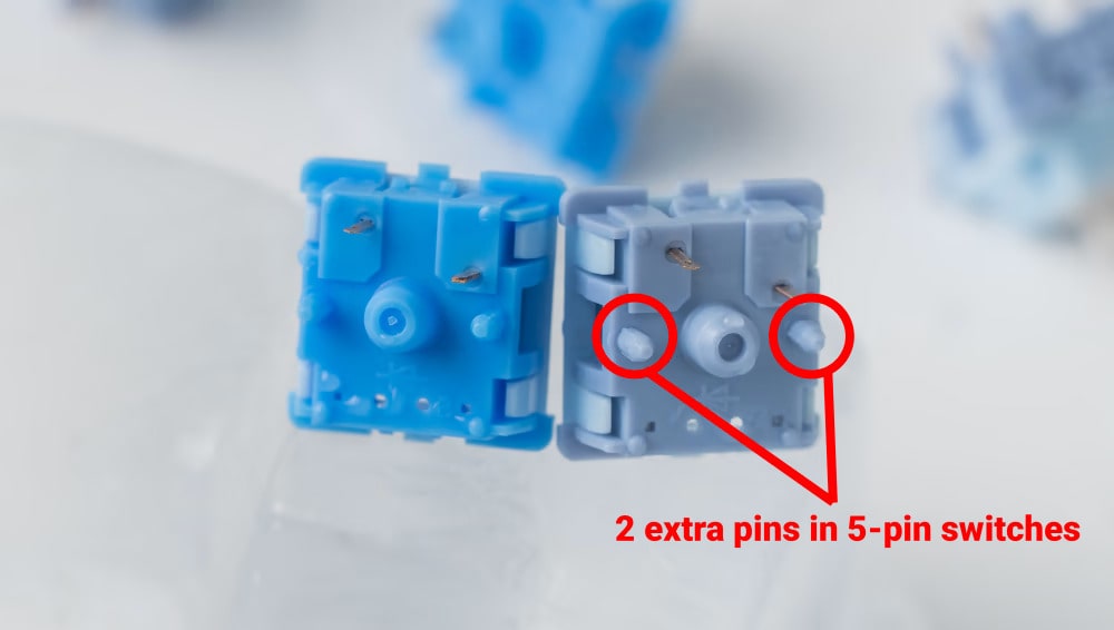 از طرف دیگر، سوییچ‌های ۵ پین (PCB-mount) برای ایجاد ثبات علاوه بر صفحه فلزی، به پین‌های اضافی نیز متکی هستند. این در حالی است که سوییچ‌های ۳ پین (Plate-mount) فقط به صفحه فلزی برای این منظور وابسته‌اند.